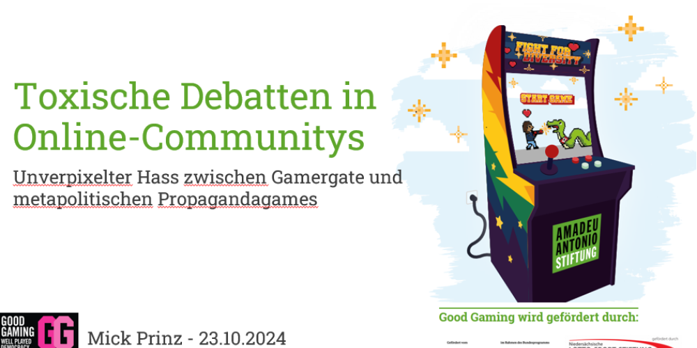 76% aller Spieler*innen haben schon Hass im Gaming erlebt. Von diesen Erlebnissen gab es am 23.10. auch einige persönliche Schilderungen aus der Runde unserer Teilnehmenden. Als Bildungsreferent des Projekts Good Gaming der Amadeu-Antonio-Stiftung konnte Mick Prinz mit besonders eindrücklichen Beispielen aus der Praxis zeigen, welche Formen dieser Hass in verschiedenen Gaming-Communities annehmen kann.